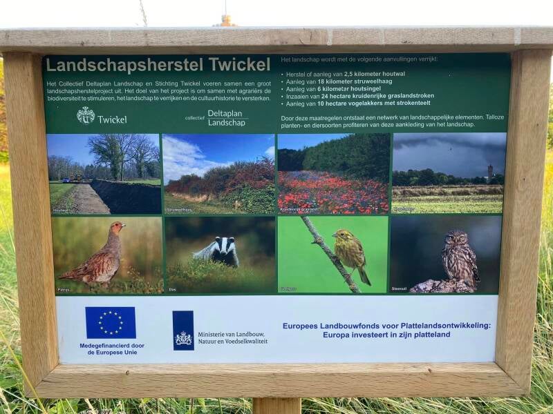 De stichting Twickel plaatste borden aan de Lage Eschweg bij de watertoren waarop het bestuur aankondigt 24 hectare grasland kruidenrijk in te gaan zaaien. Dat is goed nieuws voor de weidevogels.